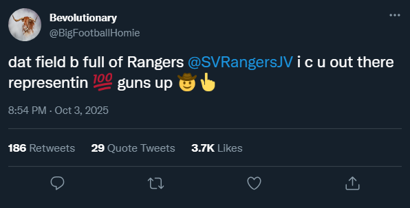 The Ranger Reporter headed to Jumbo Evans Sports Park Friday night to camp out and claim a premium spot for the anticipated game of the week on Saturday morning. Turning up early turned out to be unnecessary. The chatter had been building from the moment the Hill Country Youth Football League released the schedule in late August. As each revised schedule was released, of which there were many, you couldn’t help but check to see if the clash between Smithson Valley JV A Blue versus Smithson Valley JV A White remained. The excitement for the matchup created quite the buzz on social media. The tags from local tweets have been flooding X, formerly known as Twitter, ever since.